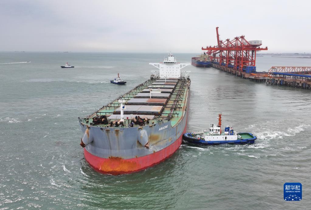 7月10日,一艘輪船在唐山港曹妃甸港區礦石碼頭卸載后在拖輪協(xié)助下離港(無(wú)人機照片)。