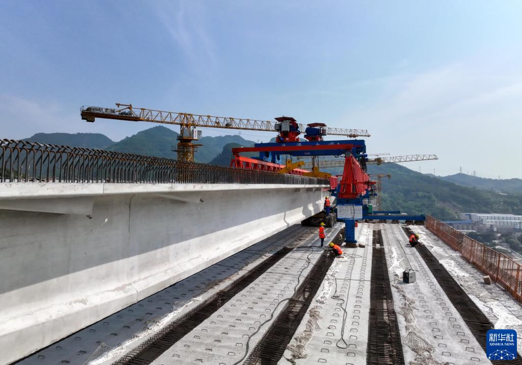 7月10日,施工人員在重慶市北碚區渝武高速復線(xiàn)觀(guān)音峽嘉陵江特大橋架設引橋T梁(無(wú)人機照片)。