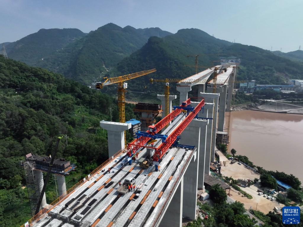 7月10日,施工人員在重慶市北碚區渝武高速復線(xiàn)觀(guān)音峽嘉陵江特大橋架設引橋T梁(無(wú)人機照片)。