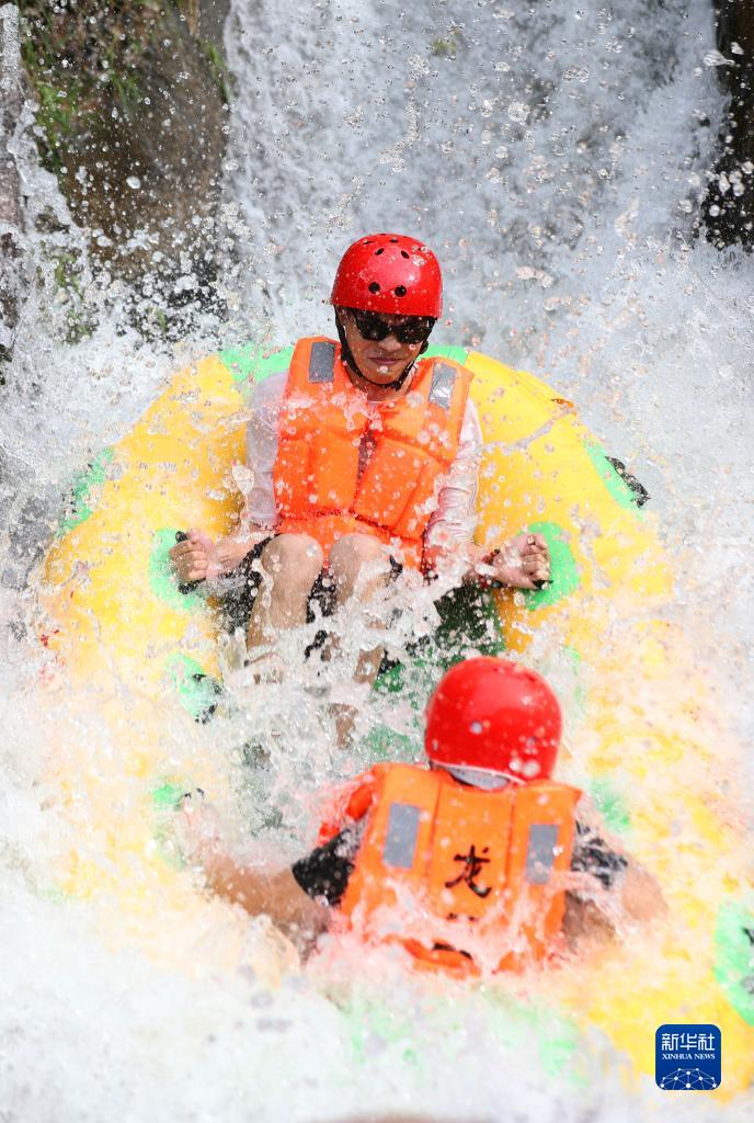 7月10日,湖南省衡陽(yáng)市衡陽(yáng)縣金蘭鎮聯(lián)龍村,游客在龍王峽漂流戲水。
