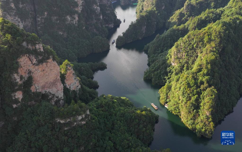 7月10日,游客乘船游覽張家界寶峰湖景區(無(wú)人機照片)。