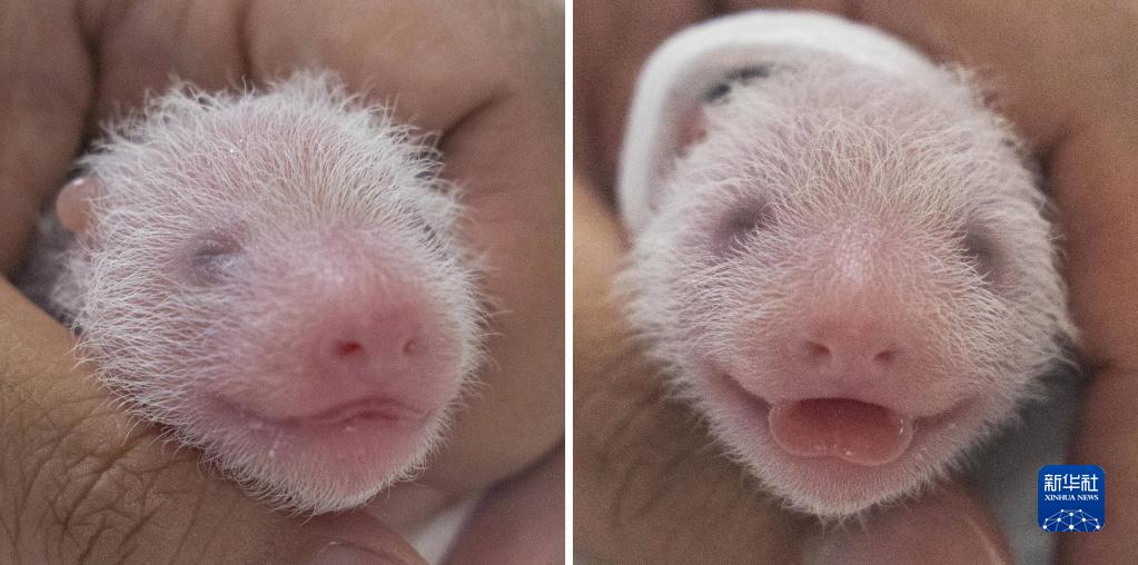 這張由韓國愛(ài)寶樂(lè )園提供的拼版照片顯示,雙胞胎大熊貓寶寶出生后在接受健康檢查。