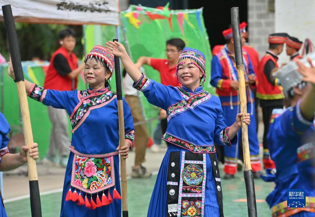 7月11日,在大化瑤族自治縣仁良村,村民跳糍粑舞。