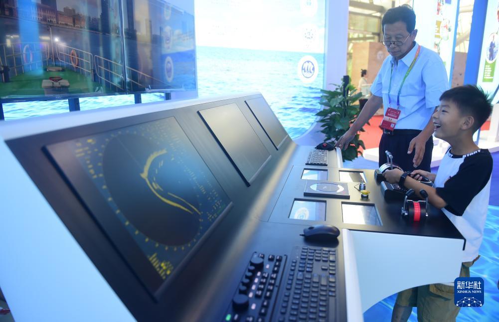 7月11日,小朋友在河北滄州舉行的2023年航??萍疾┯[會(huì )上模擬操作輪船。