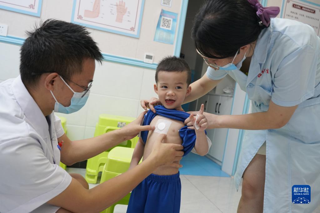 7月11日,云南省水富市婦幼保健院醫務(wù)人員為小朋友貼“三伏貼”。