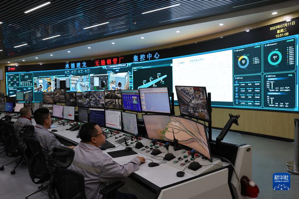 7月11日,在承德市鷹手營(yíng)子礦區一家無(wú)縫鋼管生產(chǎn)企業(yè),工作人員在集控中心工作。