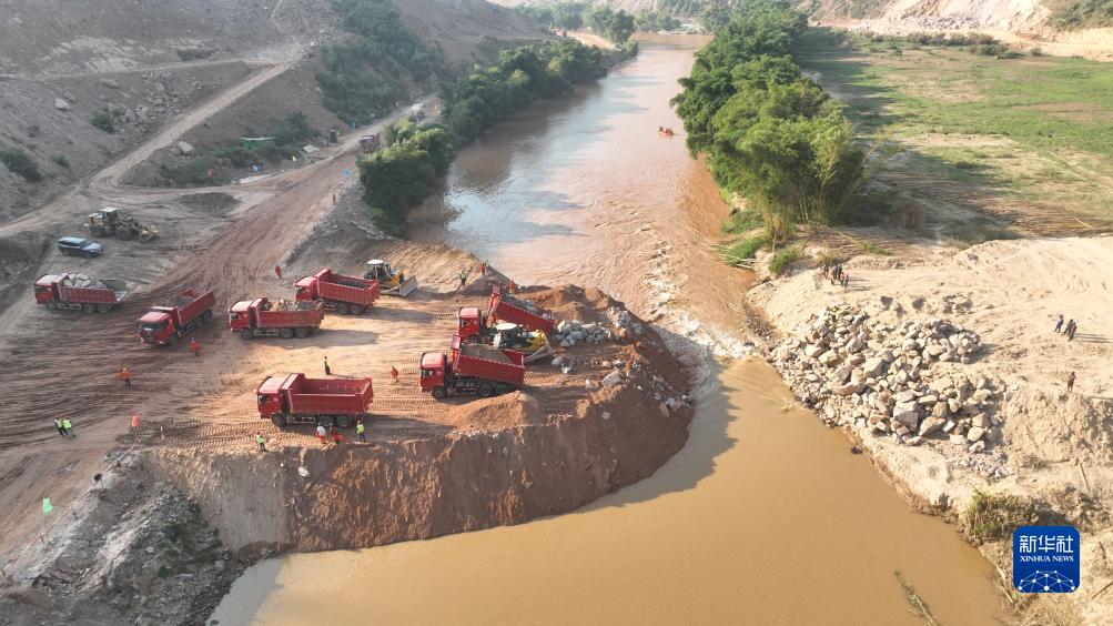 這是7月10日在盧旺達北方省加肯凱市拍攝的中企承建盧旺達那巴龍格河二號水電站項目截流現場(chǎng)(無(wú)人機照片)。