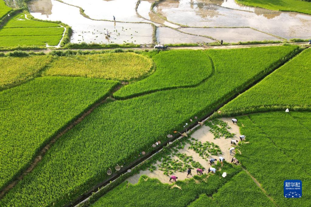 7月11日,在湖南省婁底市雙峰縣井字鎮花山村,農民在田間起秧(無(wú)人機照片)。