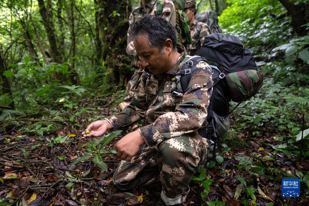 7月8日,在高黎貢山國家級自然保護區,何貴品(前)拾起一顆怒江金絲猴最?lèi)?ài)吃的山香果。新華社記者 費茂華 攝