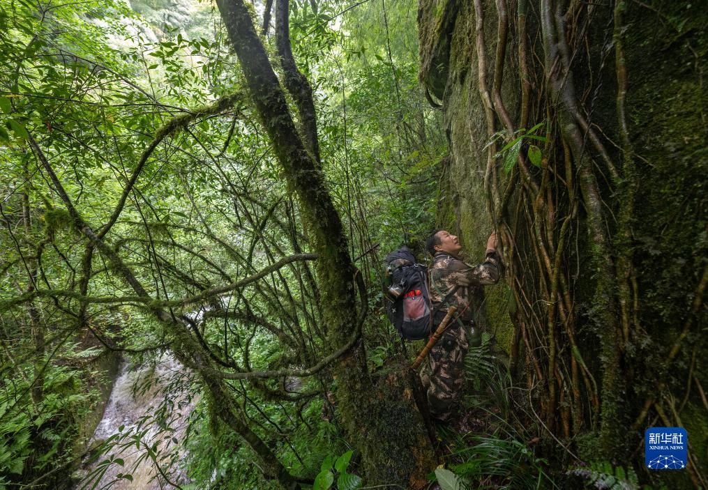 7月8日,在高黎貢山國家級自然保護區,何貴品準備攀爬懸崖。新華社記者 費茂華 攝