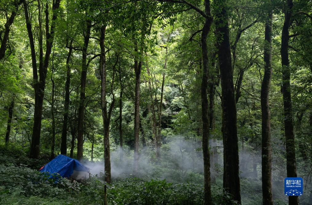 7月8日,在高黎貢山國家自然保護區,巡護隊員在搭建的棚子內休息。新華社記者 費茂華 攝