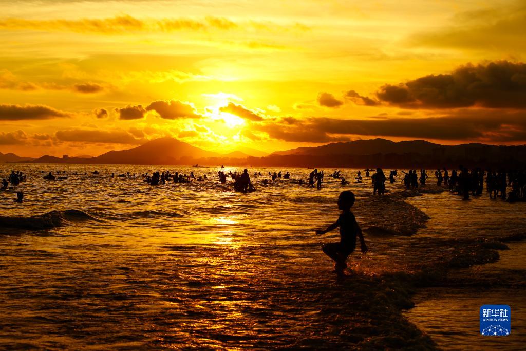 7月11日,家長(cháng)帶著(zhù)孩子在海南省三亞市三亞灣戲水消暑。