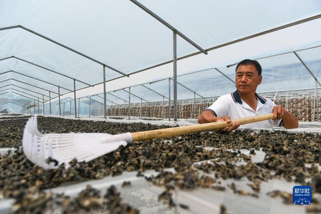 7月11日,在內蒙古扎蘭屯市扎蘭屯黑木耳產(chǎn)業(yè)孵化園區內,工作人員在晾曬黑木耳。