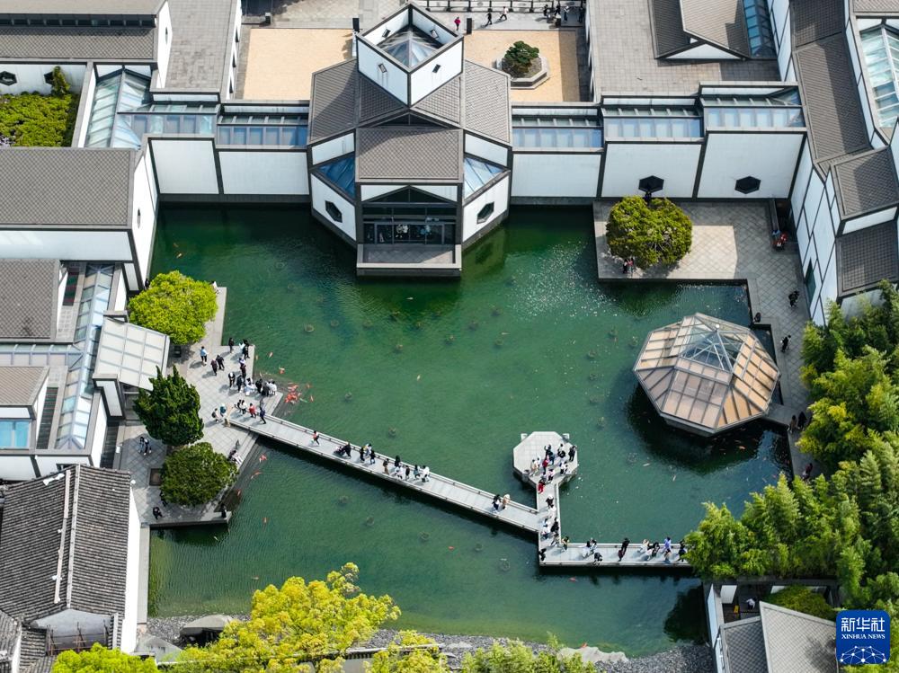 游客在蘇州博物館內參觀(guān)游玩(無(wú)人機照片,4月5日攝)。