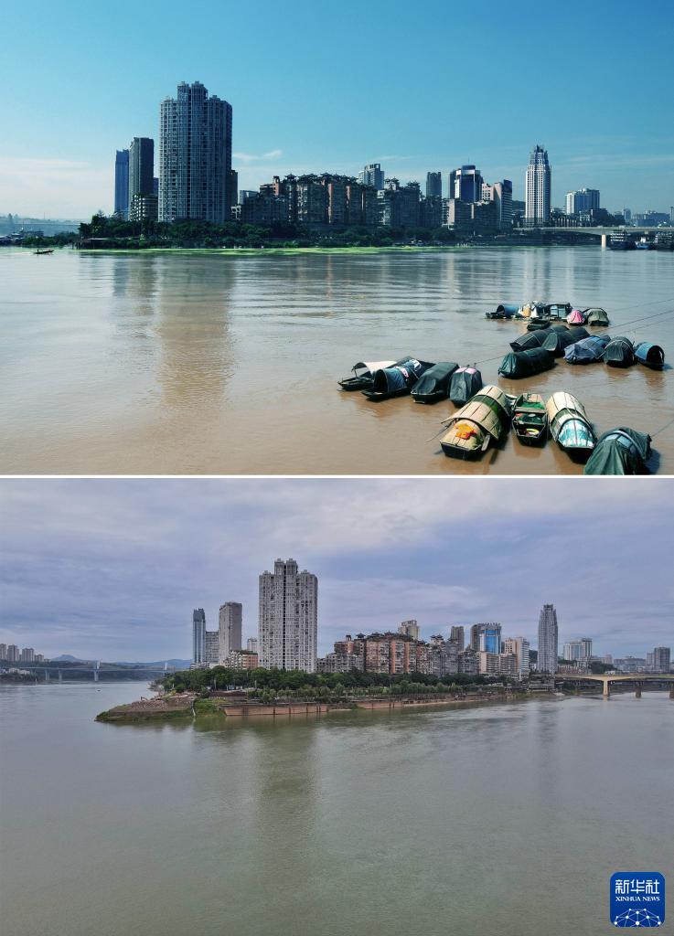 拼版照片:上圖為2012年7月,在瀘州館驛嘴沱江匯入長(cháng)江處,多艘漁船在此??浚ú苄l兵攝);下圖為2023年6月1日拍攝的瀘州館驛嘴風(fēng)光(新華社記者劉坤攝)。2019年,瀘州全面啟動(dòng)長(cháng)江流域重點(diǎn)水域漁民退捕工作,漁船上岸集中處置,漁民上岸分類(lèi)安置。