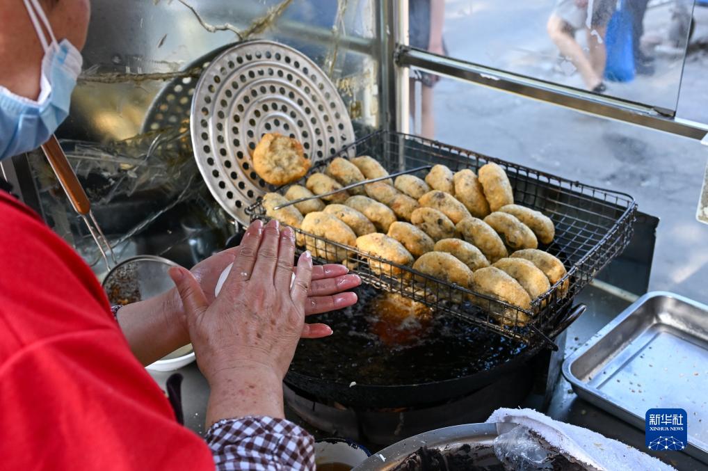 7月10日,在天津市紅橋區西關(guān)大街一家早點(diǎn)鋪,商家在制作炸糕。