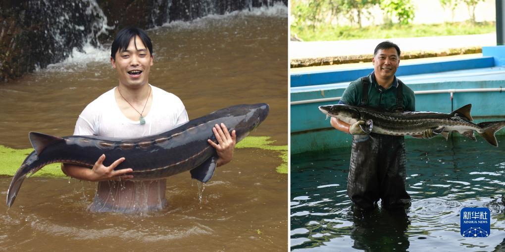這是一張拼版照片:左圖為青年周亮與長(cháng)江鱘(曾朗 攝);右圖為2023年6月27日拍攝的周亮與長(cháng)江鱘(新華社記者 胥冰潔 攝)。