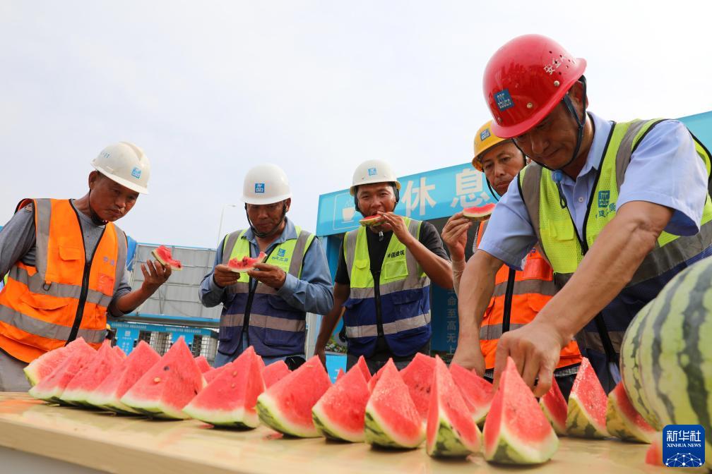 7月12日,中建二局合肥肥西產(chǎn)城融合安置點(diǎn)二期項目部工人在工地休息區茶水亭吃西瓜解暑。