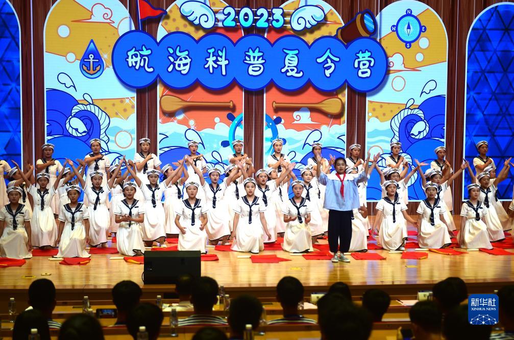 7月12日,在2023年航??破障牧顮I(yíng)開(kāi)營(yíng)儀式上,學(xué)生表演節目。