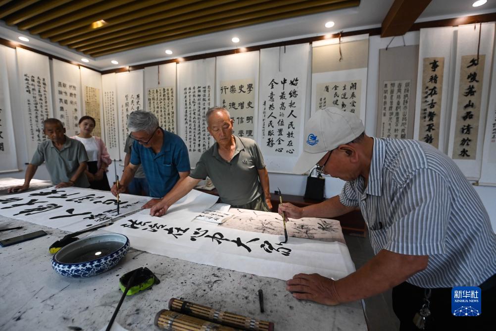 7月13日,在杭州市臨安區板橋鎮上田村文化禮堂,書(shū)法愛(ài)好者書(shū)寫(xiě)用于法治宣傳教育的書(shū)法作品。