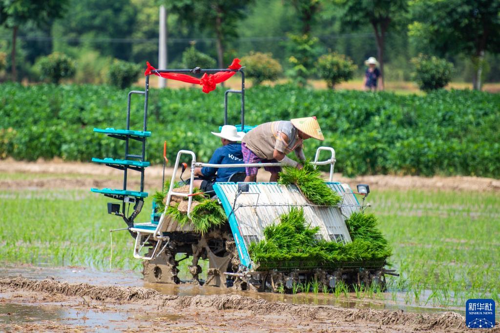 7月13日,在巖汪湖鎮武竺山村,農民駕駛插秧機進(jìn)行水稻插秧作業(yè)。