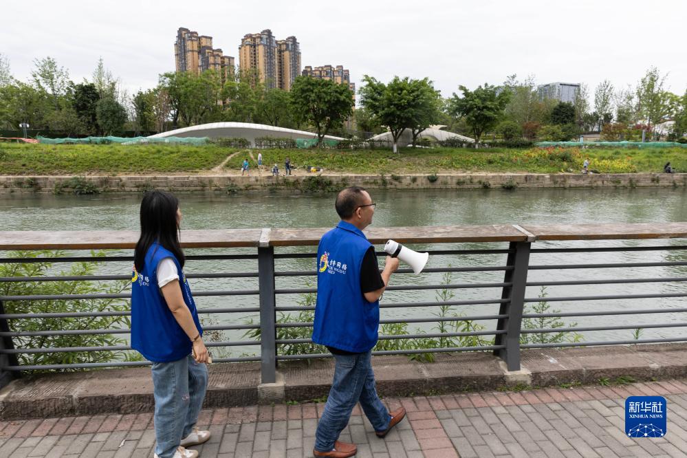 成都市金牛區新橋社區社區河長(cháng)工作室的工作人員孫浪一(右)、曾靜在巡府河(6月19日攝)。成都市建立四級河長(cháng)制,注重治管并舉,持續鞏固治理成效。新華社記者 江宏景攝