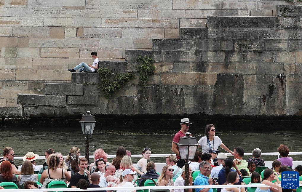 這是法國巴黎塞納河上的游船從一名在河邊小憩的男子附近駛過(guò)(6月28日攝)。