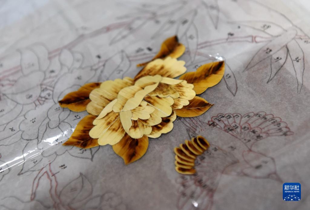 7月12日,吳永龍將拼好的一朵“花”放在底版上比對。新華社記者 黃曉勇 攝