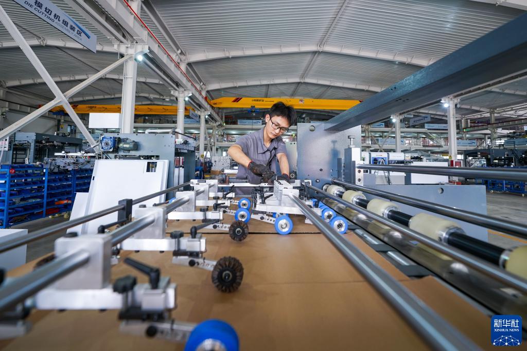 7月13日,河北省玉田縣一家印刷包裝機械制造企業(yè)的工人在安裝產(chǎn)品零部件。