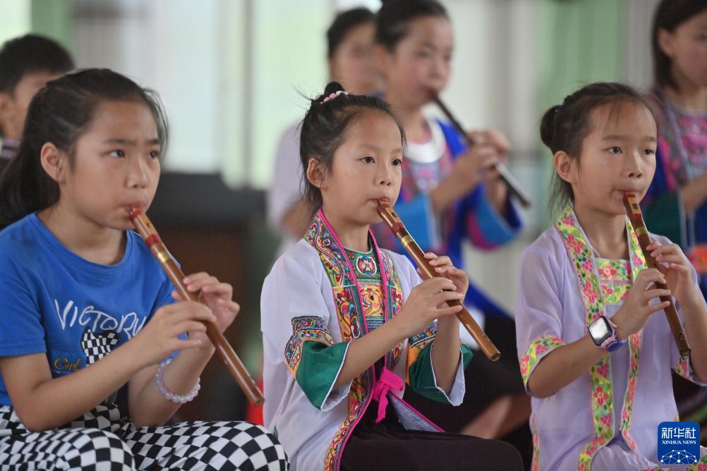 7月13日,在廣西三江侗族自治縣文化館,小學(xué)生在學(xué)習吹侗笛。