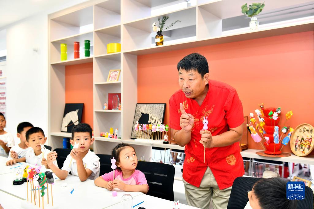 7月13日,在惠民縣姜樓鎮一處“濱濱學(xué)堂”,公益講師劉延貴教孩子們面塑知識。