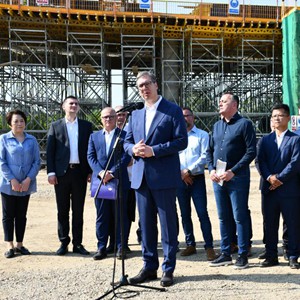 7月12日,在塞爾維亞?wèn)|部城市波扎雷瓦茨,塞爾維亞總統武契奇(前)在視察中企承建的波扎雷瓦茨至戈盧巴茨快速路施工現場(chǎng)時(shí)講話(huà)。