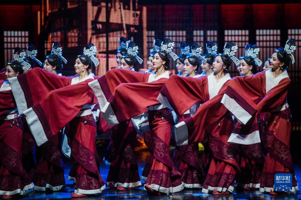 當日,舞劇《五星出東方》在武漢市湖北劇院上演。該劇的構想源于從我國新疆和田尼雅遺址出土的國家一級文物“五星出東方利中國”漢代織錦護臂。新華社記者 伍志尊 攝