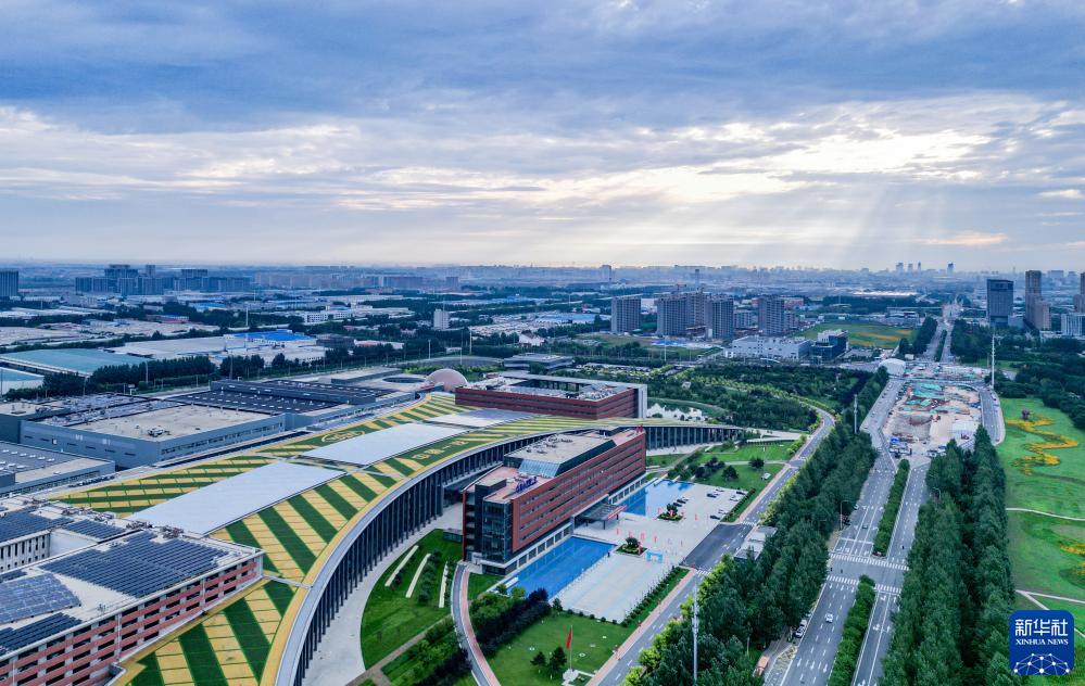 7月13日無(wú)人機拍攝的晨曦中的中國一汽總部大樓。