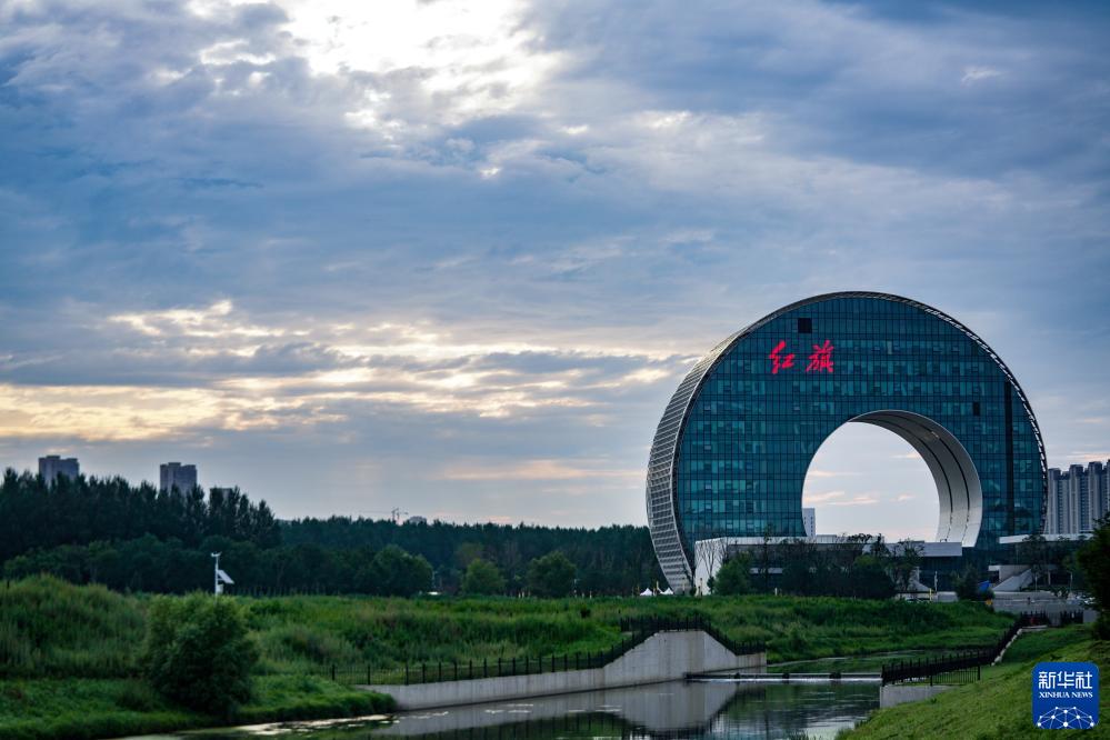 7月13日拍攝的晨曦中的一汽紅旗創(chuàng )新大廈。