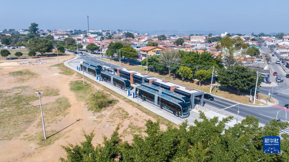 這是7月12日在巴西圣保羅州圣若澤杜斯坎普斯快速公交系統“綠線(xiàn)”始發(fā)站拍攝的比亞迪純電動(dòng)大巴(無(wú)人機照片)。