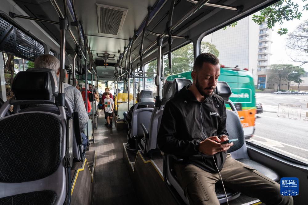 7月12日,在巴西圣保羅州圣若澤杜斯坎普斯,乘客使用比亞迪純電動(dòng)大巴座椅下的充電接口為手機充電。