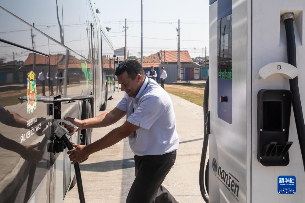 7月12日,在巴西圣保羅州圣若澤杜斯坎普斯,工作人員為比亞迪純電動(dòng)大巴充電。