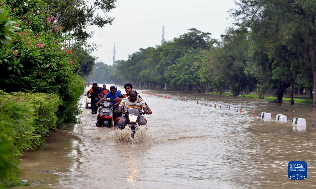 7月13日,人們在印度新德里被淹沒(méi)的道路上涉水前行。