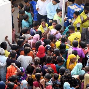 連續強降雨導致亞穆納河水位上漲,新德里部分地區被淹,市民出行和日常生活受到影響,低洼區受災居民排隊領(lǐng)取生活物資。