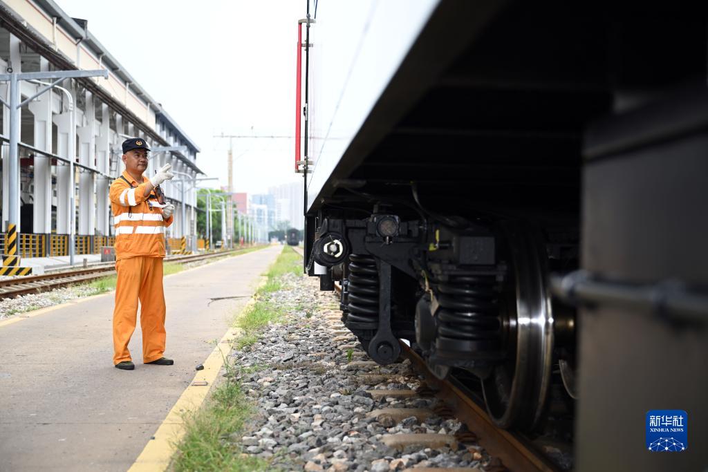 7月13日,合肥火車(chē)站運轉車(chē)間調車(chē)長(cháng)李健核對車(chē)號,檢查車(chē)輛防溜情況。