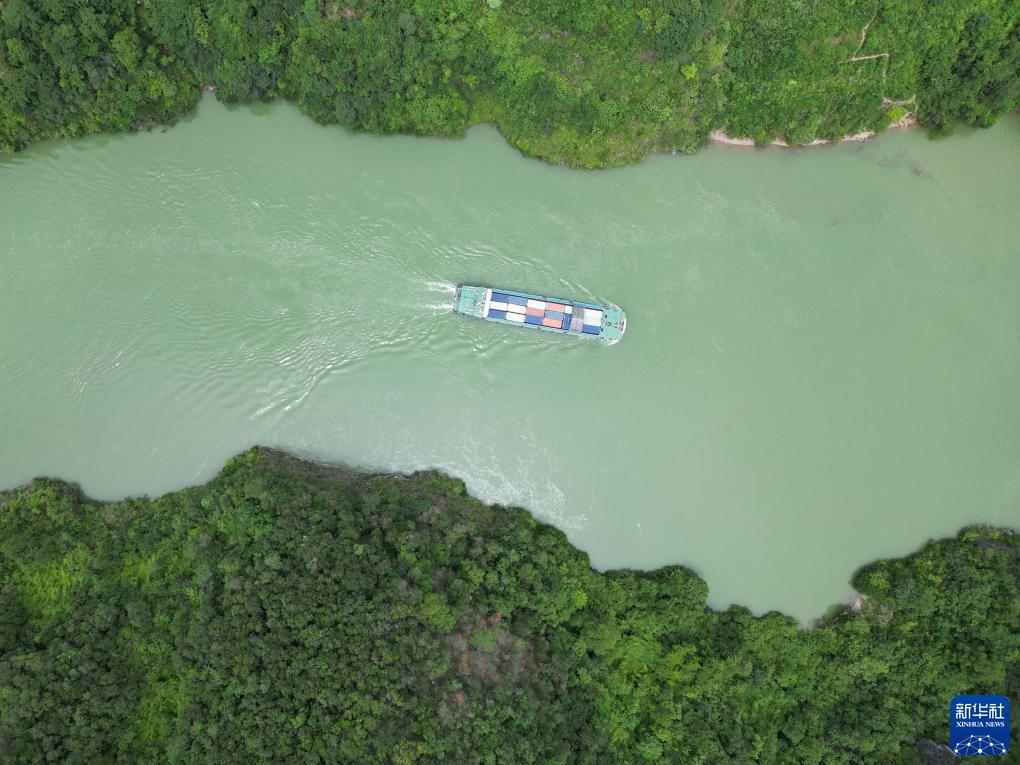 集裝箱貨輪從貴州省遵義市余慶縣沙灣碼頭駛出,前往重慶涪陵黃旗港(7月14日攝,無(wú)人機照片)。