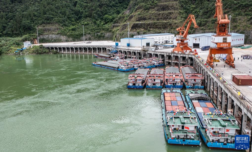 集裝箱貨輪在貴州省遵義市余慶縣沙灣碼頭整裝待發(fā)(7月14日攝,無(wú)人機照片)。