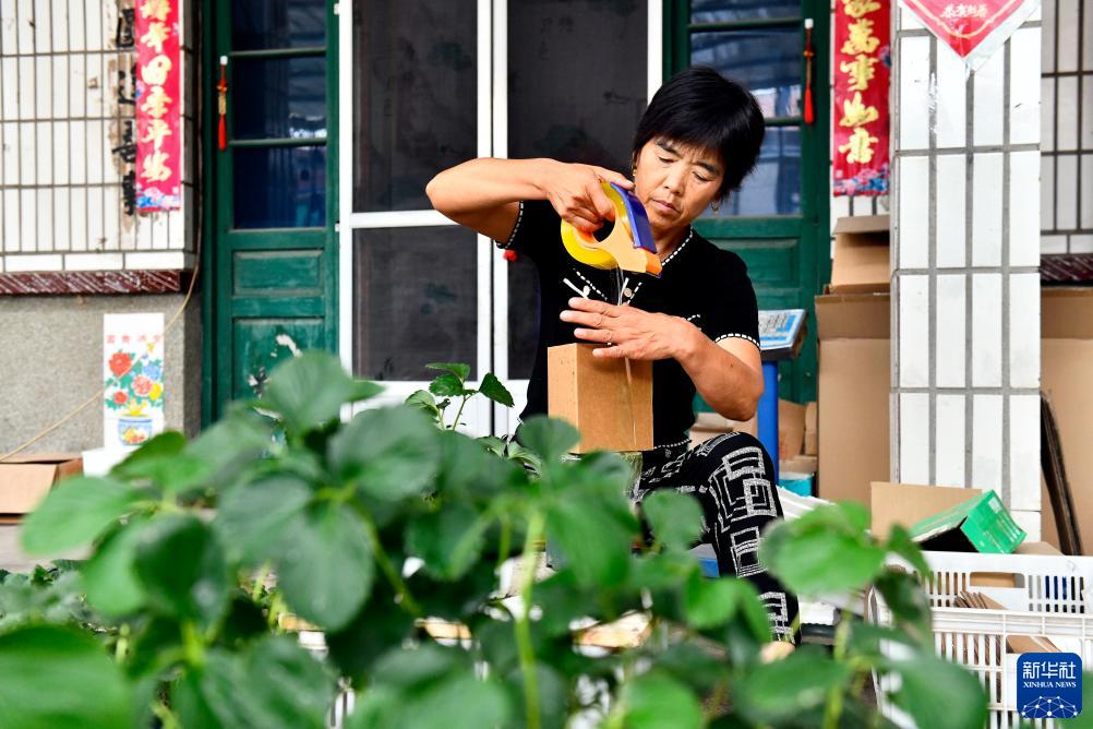 7月14日,在惠民縣石廟鎮柳編彭村,村民打包草莓苗,準備發(fā)快遞物流。
