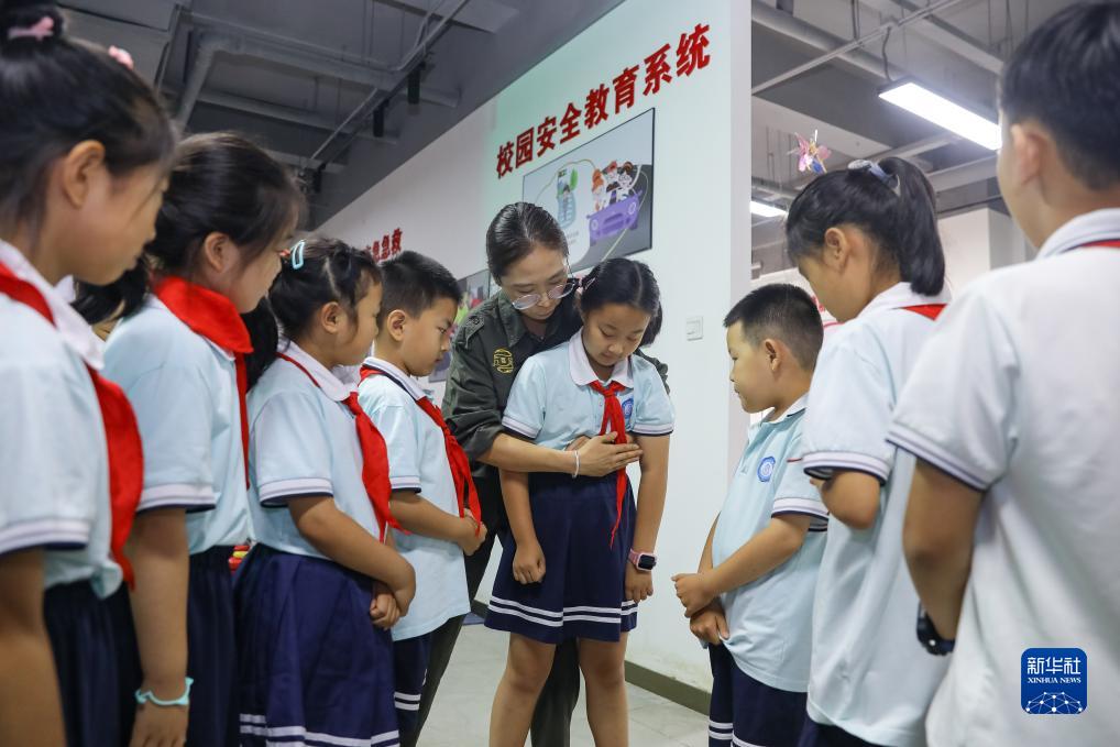 7月14日,在山東省青島市李滄區新時(shí)代文明實(shí)踐所,志愿者指導學(xué)生操作海姆立克急救法。