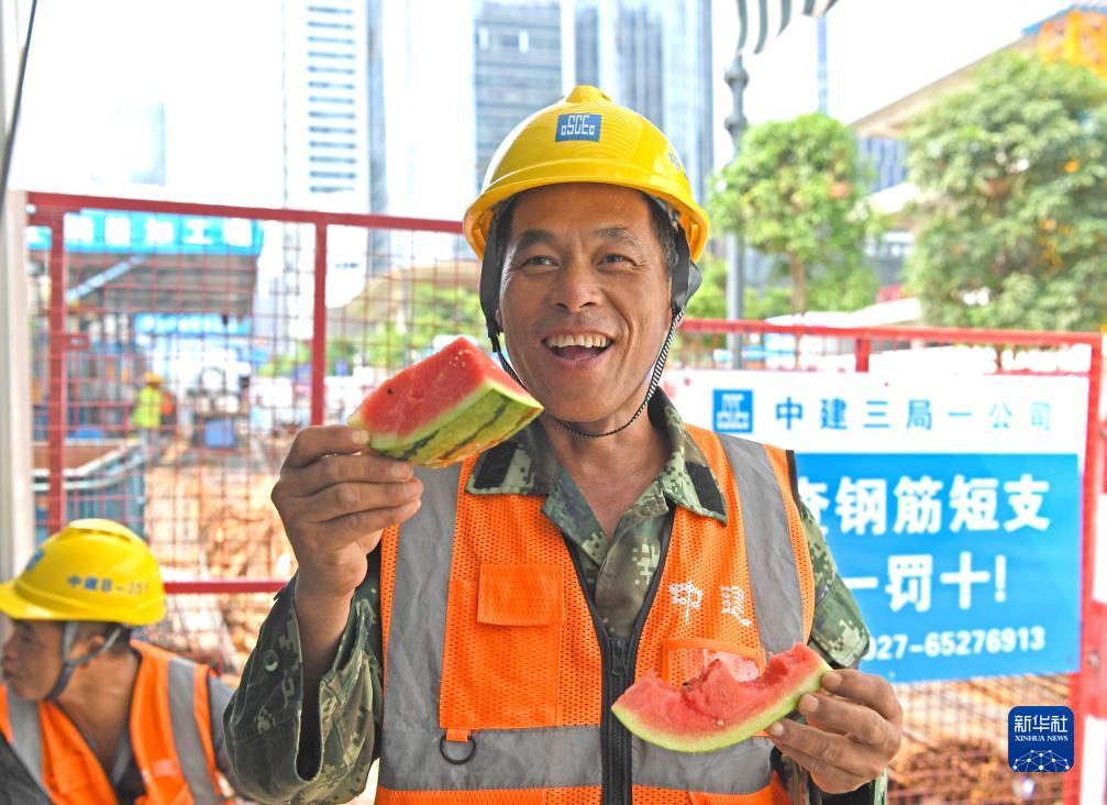 7月14日,一名工人在南寧中銀金融中心項目建設工地工友綜合服務(wù)之家吃西瓜。