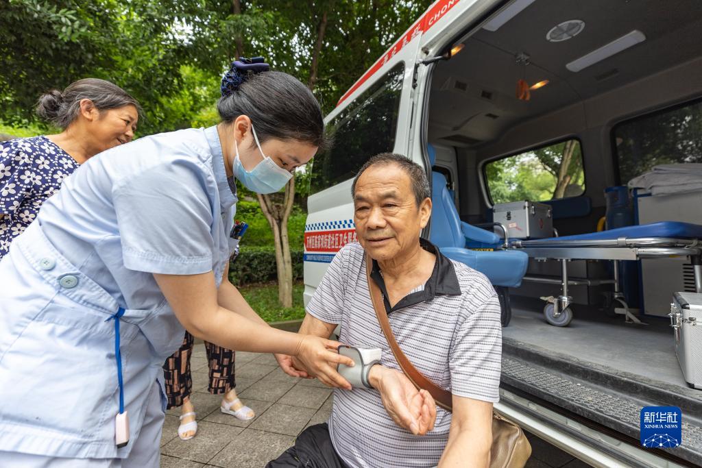 7月14日,在重慶市萬(wàn)州三中江南校區臨時(shí)安置點(diǎn)內,醫護人員為轉移安置人員測量血壓。