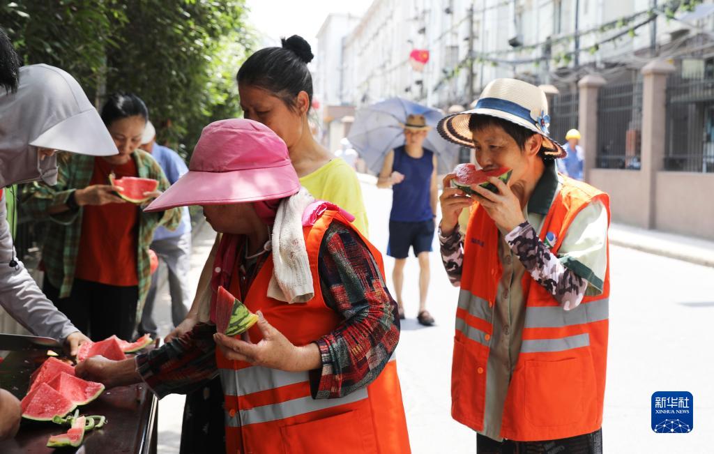 在江西南昌青山湖區站東街道,環(huán)衛工人吃西瓜補充水分(7月14日攝)。
