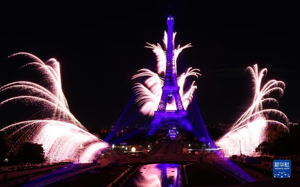 7月14日,焰火在法國巴黎埃菲爾鐵塔周?chē)`放。