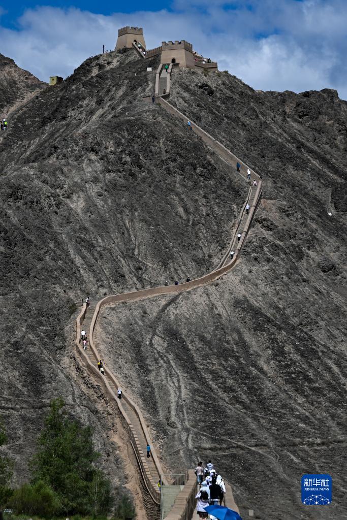 游客在甘肅省嘉峪關(guān)市游覽懸壁長(cháng)城(7月13日攝)。